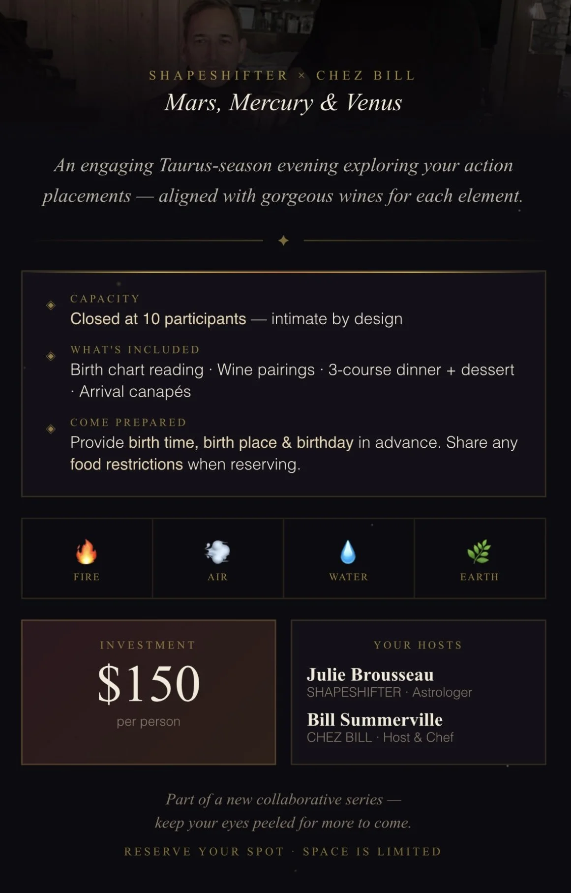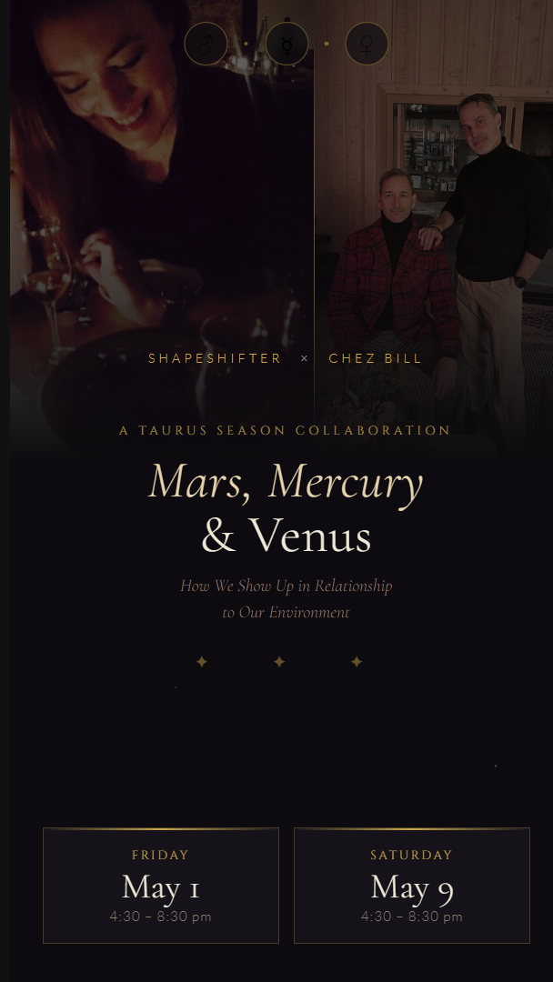 SHAPESHIFTER is excited to soft-launch our Astrological offerings alongside our real-life bestie, Bill Summerville of CHEZ BILL. For inquiries, reservations or to be added to the list for future event notifications, please use our “CONTACT” page. We can’t wait to meet you!